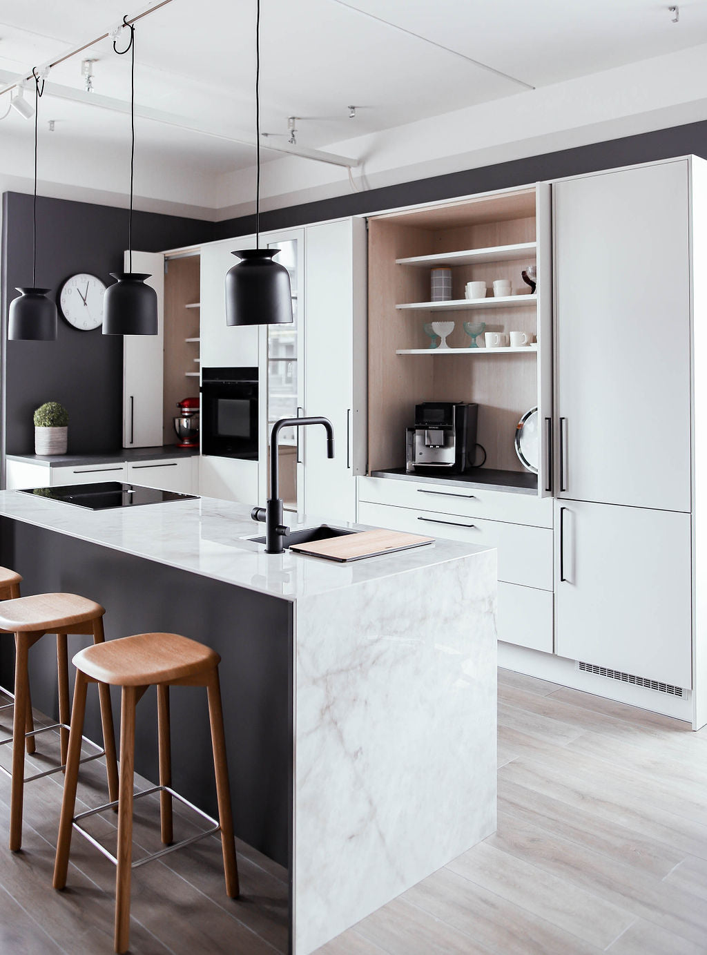Tämä keittiö on suunniteltu vastaamaan vaativankin kokkaajan tarpeisiin. Runsaat säilytystilat, kuten apteekkarikaappi ja kulmamekanismi, tarjoavat fiksuja ratkaisuja arjen sujuvoittamiseen. Hyvinkin varustellut aamiaiskaapit tarjoavat tilaa kaikelle tarvittavalle – isommat kodinkoneet löytävät paikkansa kulmassa, kun taas jääkaapin vieressä säilyvät kätevästi kaikki aamiaisvälineet.
