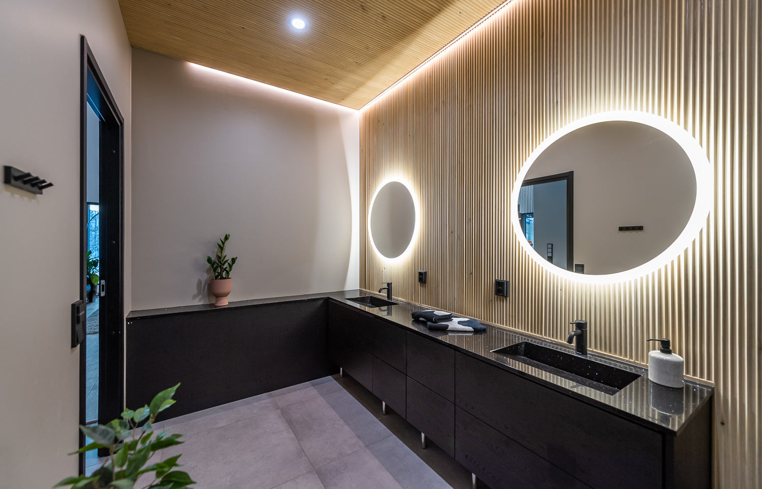 Arjen vilskeessä ei tarvitse varata kylppärivuoroja, sillä tähän kylpyhuoneeseen mahtuu useampikin laittautuja kerrallaan pitkän tason, kahden integroidun altaan ja LED-valopeilin ansiosta. Runsaan kaappitilan ansiosta tasot pysyvät myös siistinä pikkutavaroista. Musta, harmaa ja sormipaneelit muodostavat harmonisen kokonaisuuden, jossa viihtyvyys on taattu.