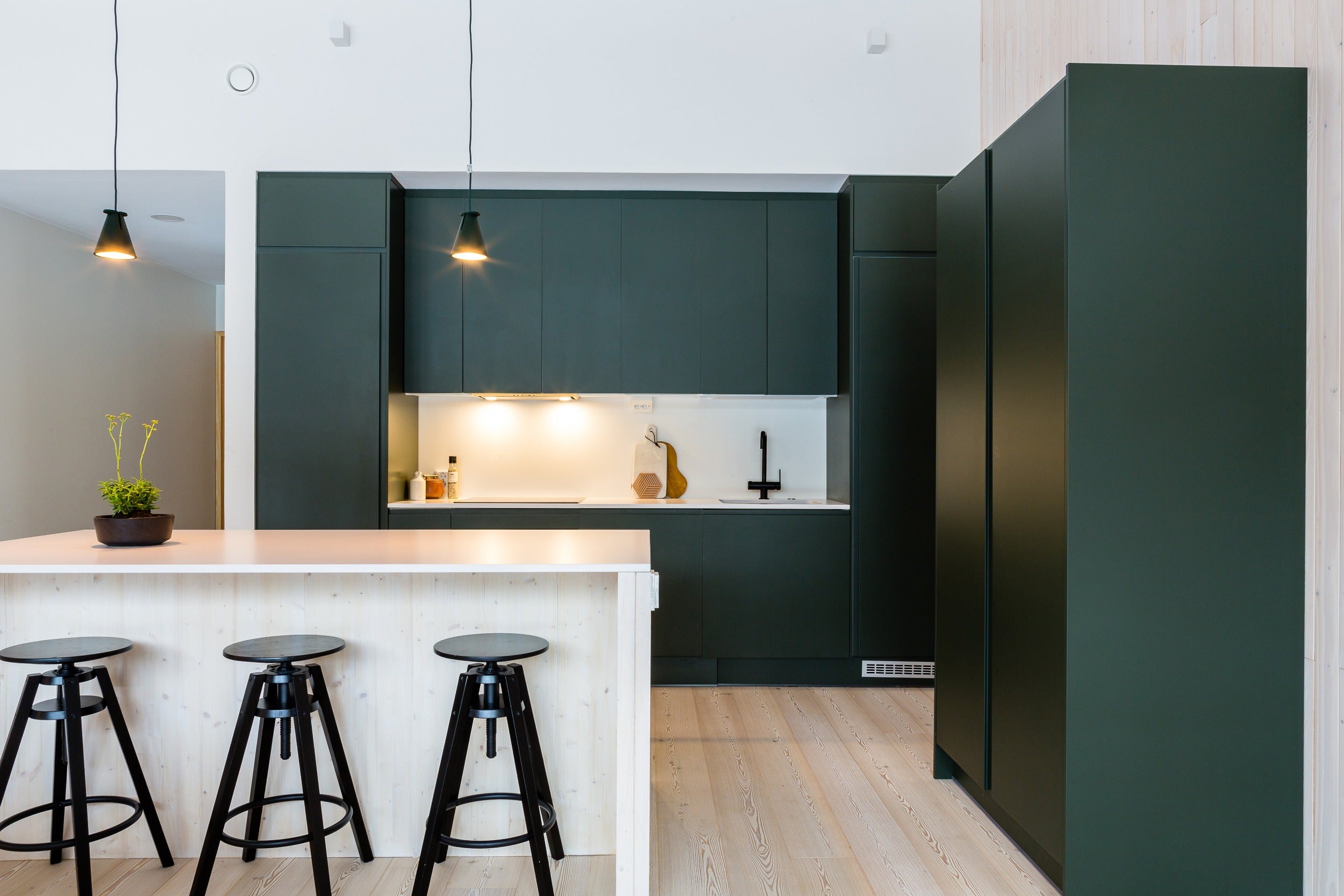 Matta-keittiön puhdaslinjainen ja minimalistinen sisustustyyli on luotu vetimettömillä Päätyripa-ovilla. Sisustuksessa on käytetty rohkeasti metsän vihreää, joka muodostaa vaalean puun kanssa kauniin ja raikkaan kokonaisuuden. Metsän vihreä on muuten yksi suosituimmista maalisävyistämme sekä yksi 8000 saatavilla olevista sävyistämme!