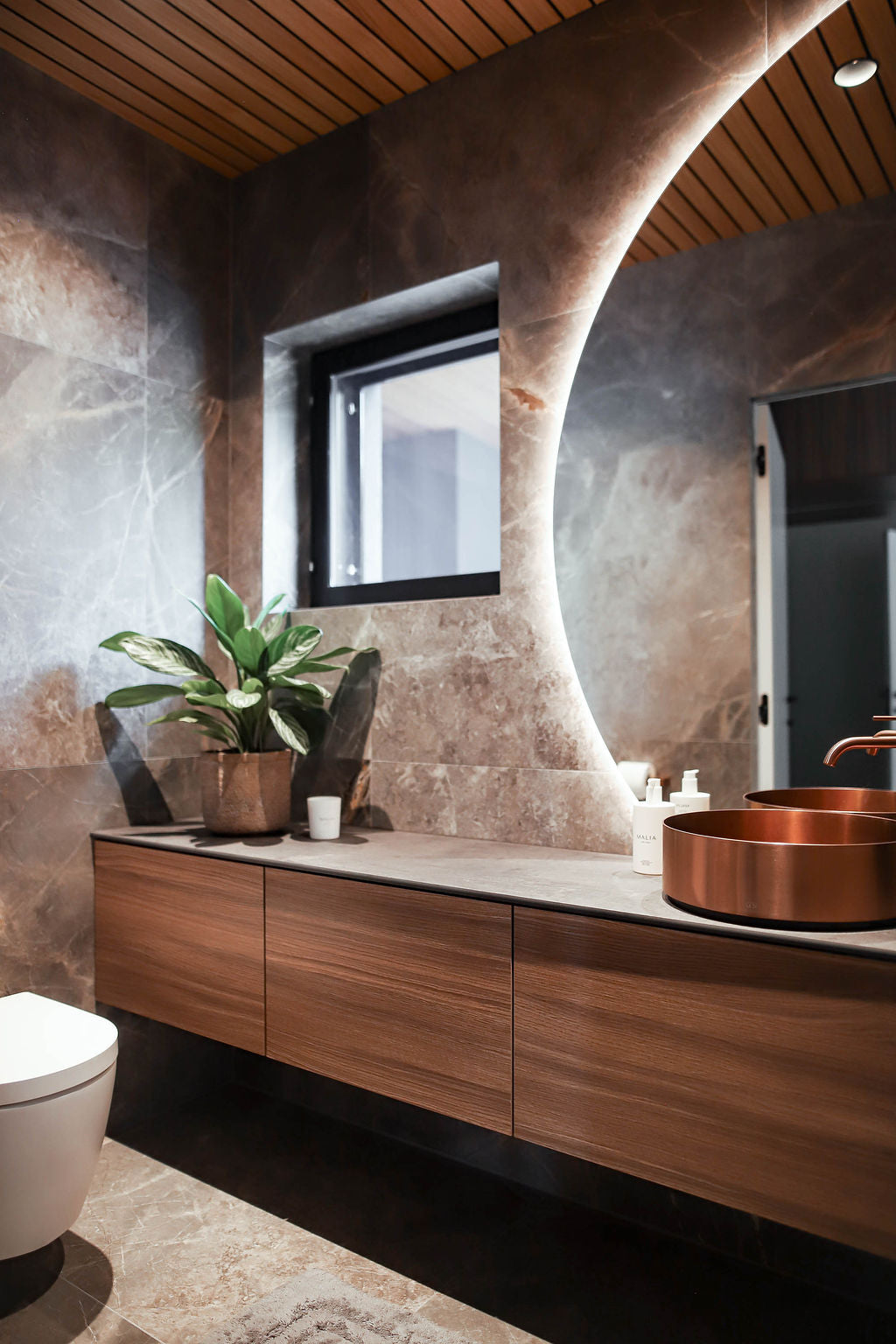 Tämä WC on esimerkki täydellisestä viimeistelystä ja huolellisesti mietitystä designista. Millilleen mittojen mukaan suunnitellut kalusteet hyödyntävät tilan maksimaalisesti ja tuovat ripauksen luksusta arkeen. Harmoninen kaakaon sävy luo lämpimän ja kutsuvan tunnelman, joka kestää aikaa ja miellyttää silmää. Kokonaisuuden kruunaa upea, mittatilaustyönä tehty puolipyöreä valopeili, joka tuo tilaan pehmeyttä ja tyylikästä eleganssia. Tässä WC:ssä toimivuus ja esteettisyys yhdistyvät saumattomasti, luoden rauhallisen ja tyylikkään tilan, jossa jokainen yksityiskohta on tarkkaan harkittu.