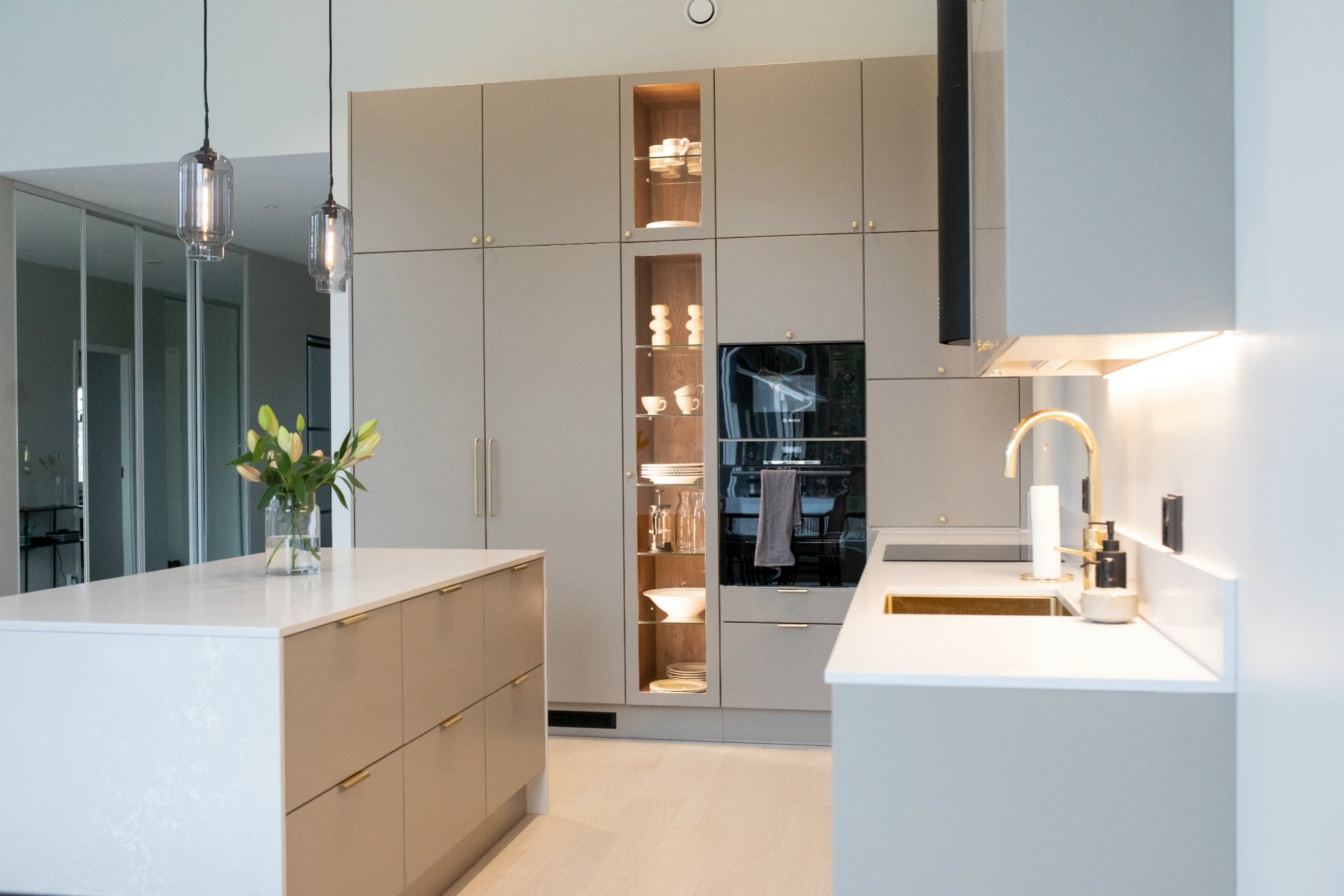 Näyttävä, laadukas saareke on tämän toimivan keittiön luottoelementti. Hillitty kullan sävy vetimissä, hanassa ja yksityiskohdissa antavat viimeisen tyylikkään loppusilauksen keittiön ilmeelle.