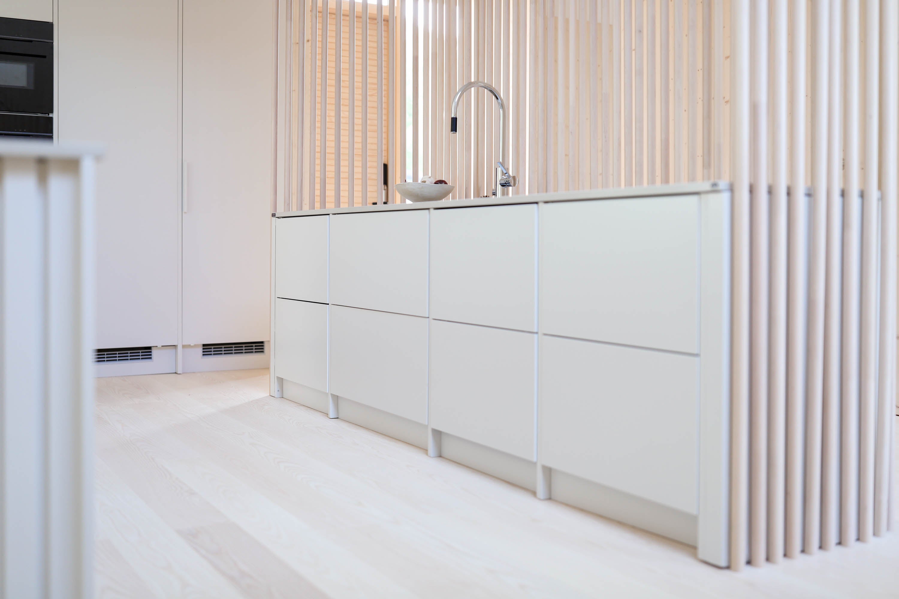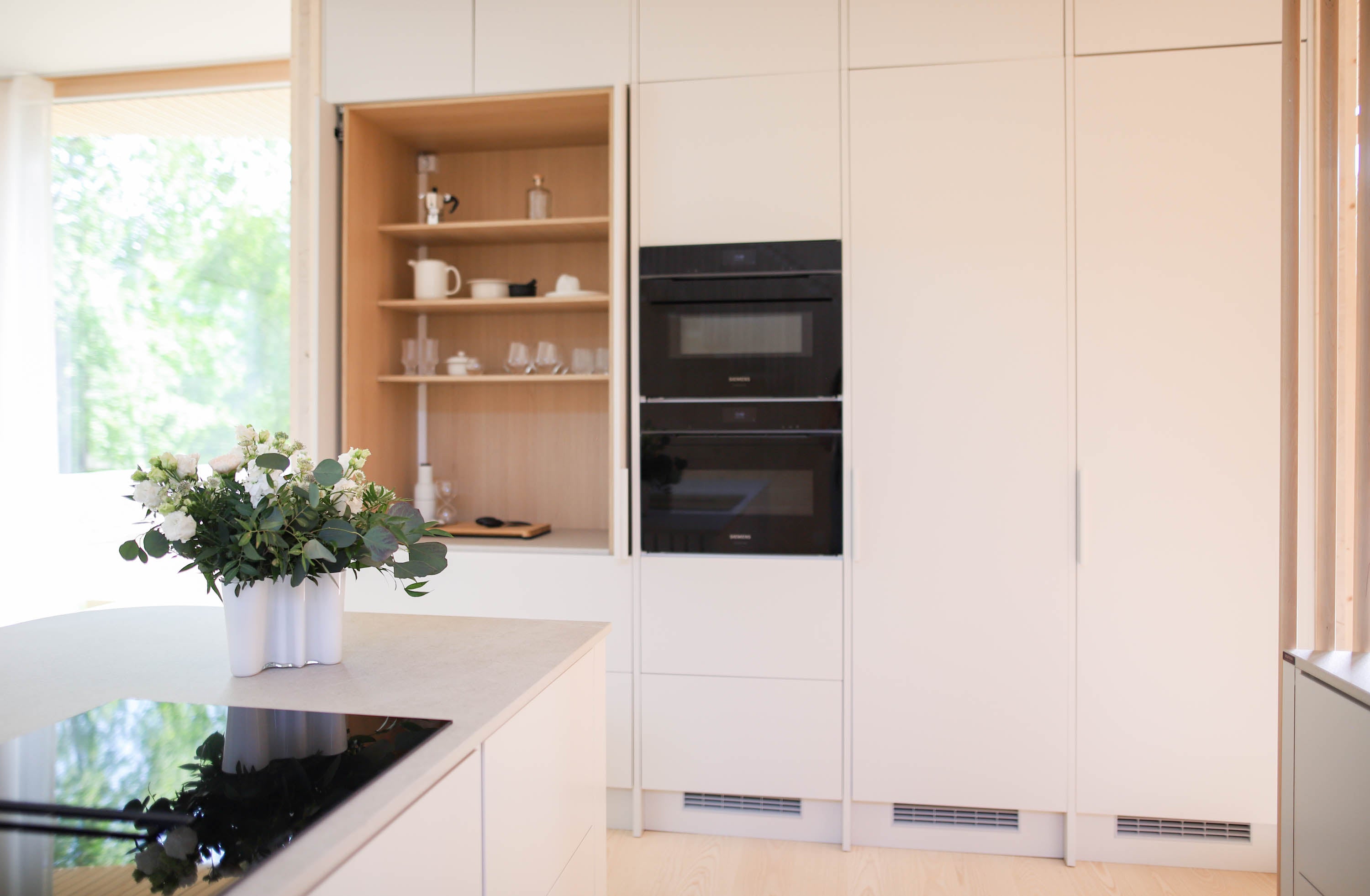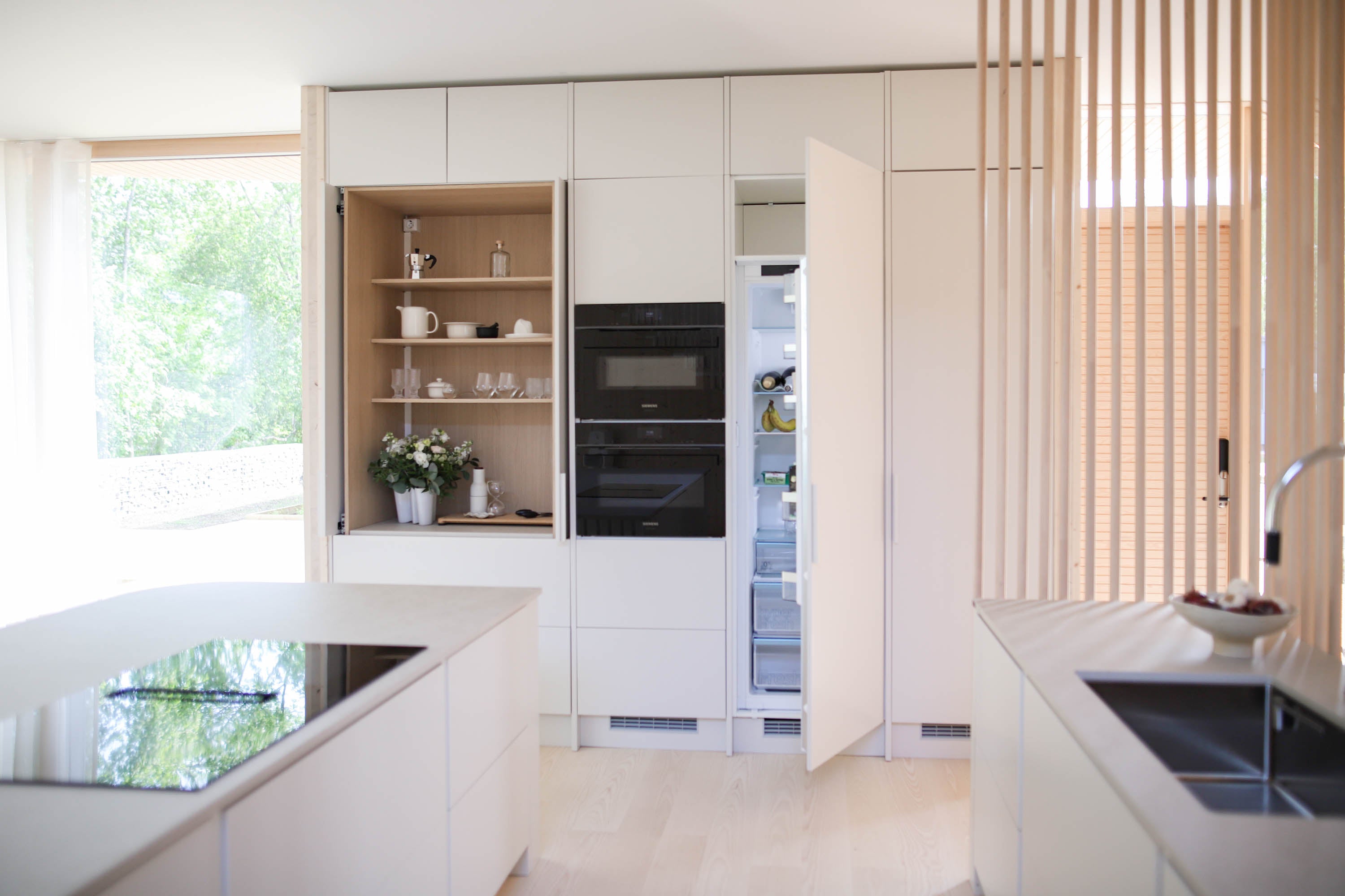 Malliston ovi- ja tasoratkaisut ovat hienovaraisia, mutta yksityiskohtaisesti viimeisteltyjä. Vetimettömät pinnat ja huomaamattomat linjat antavat kokonaisuudelle yhtenäisen ja rauhallisen ilmeen, joka kestää aikaa ja katsetta. Säde-keittiössä muotoilu ei ole vain esteettistä, vaan myös ergonomista. Kaikki on suunniteltu sujuvaa ja intuitiivista arkea varten. Työtasojen pehmeä mattapinta, vaaleiden puunsävyjen vivahteet ja korkealaatuiset mekanismit muodostavat kokonaisuuden, jossa estetiikka ja toiminnallisuus sulautuvat saumattomasti yhteen.