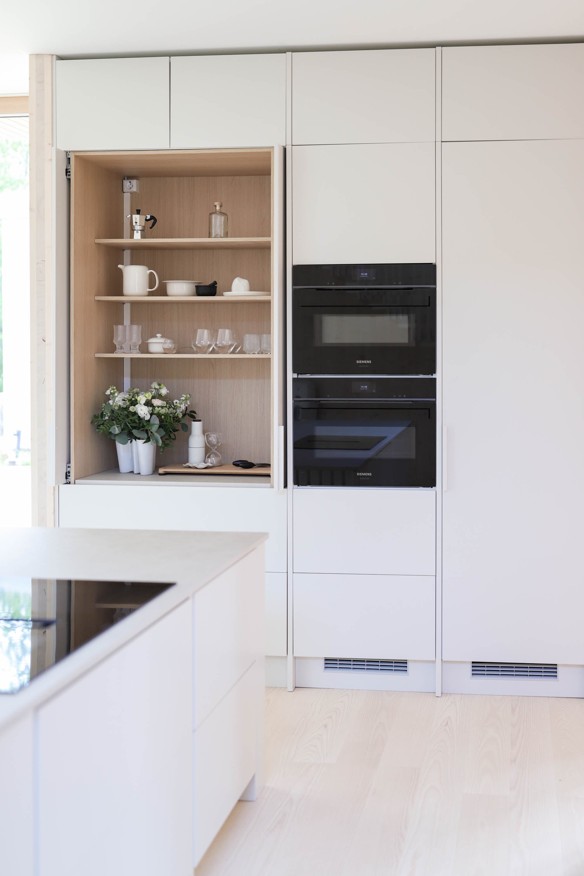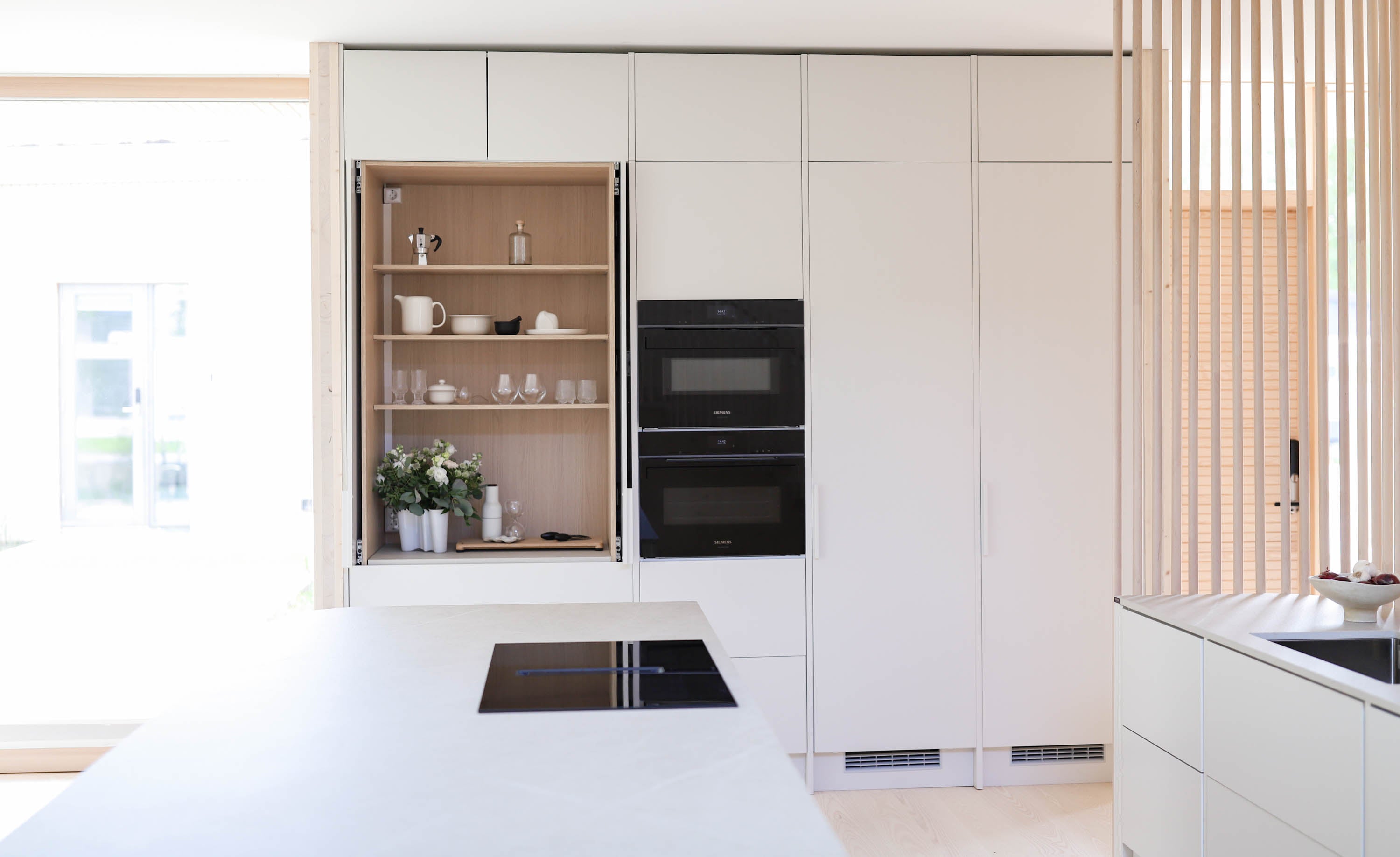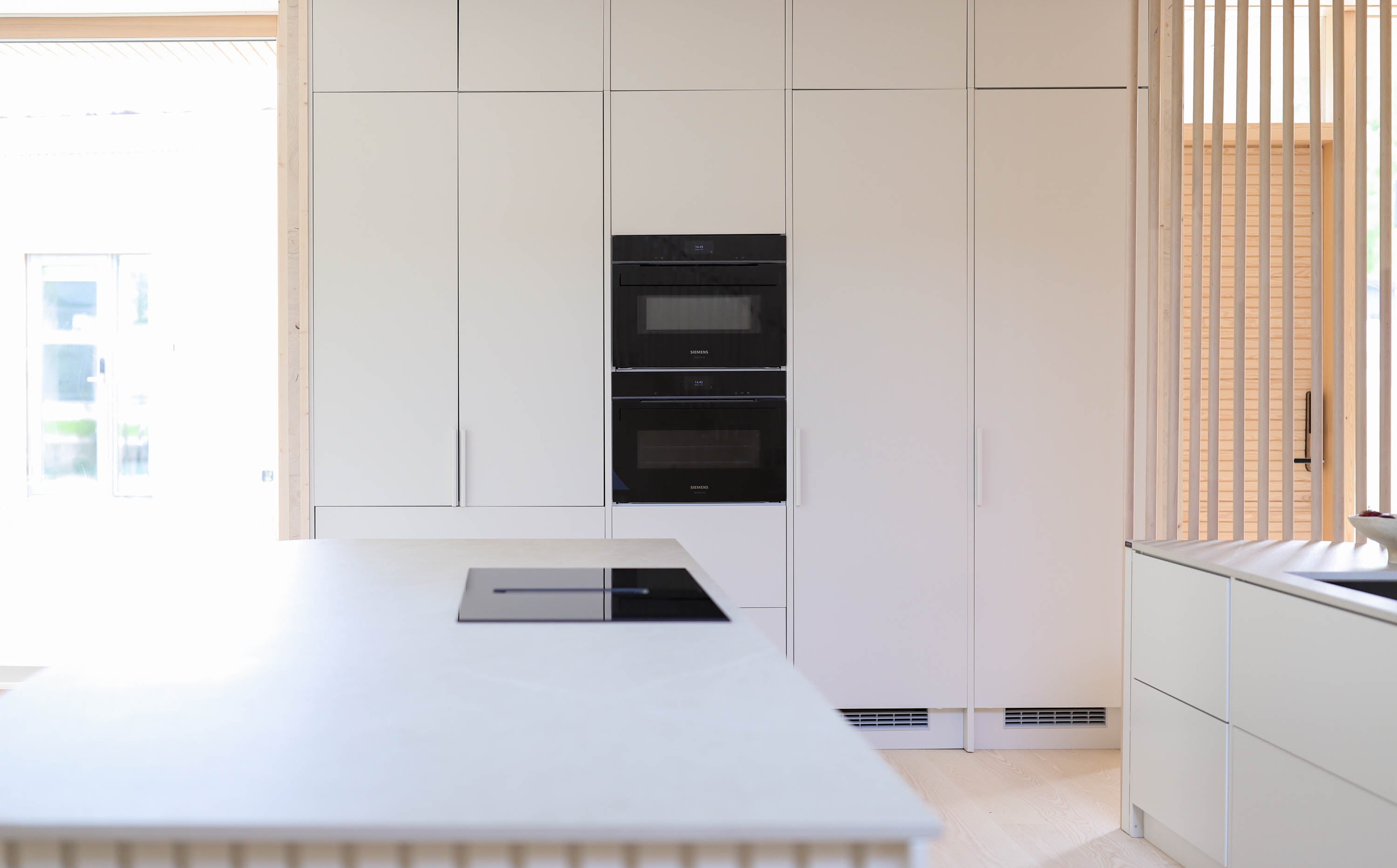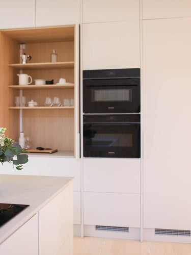 Malliston ovi- ja tasoratkaisut ovat hienovaraisia, mutta yksityiskohtaisesti viimeisteltyjä. Vetimettömät pinnat ja huomaamattomat linjat antavat kokonaisuudelle yhtenäisen ja rauhallisen ilmeen, joka kestää aikaa ja katsetta. Säde-keittiössä muotoilu ei ole vain esteettistä, vaan myös ergonomista. Kaikki on suunniteltu sujuvaa ja intuitiivista arkea varten. Työtasojen pehmeä mattapinta, vaaleiden puunsävyjen vivahteet ja korkealaatuiset mekanismit muodostavat kokonaisuuden, jossa estetiikka ja toiminnallisuus sulautuvat saumattomasti yhteen.