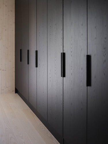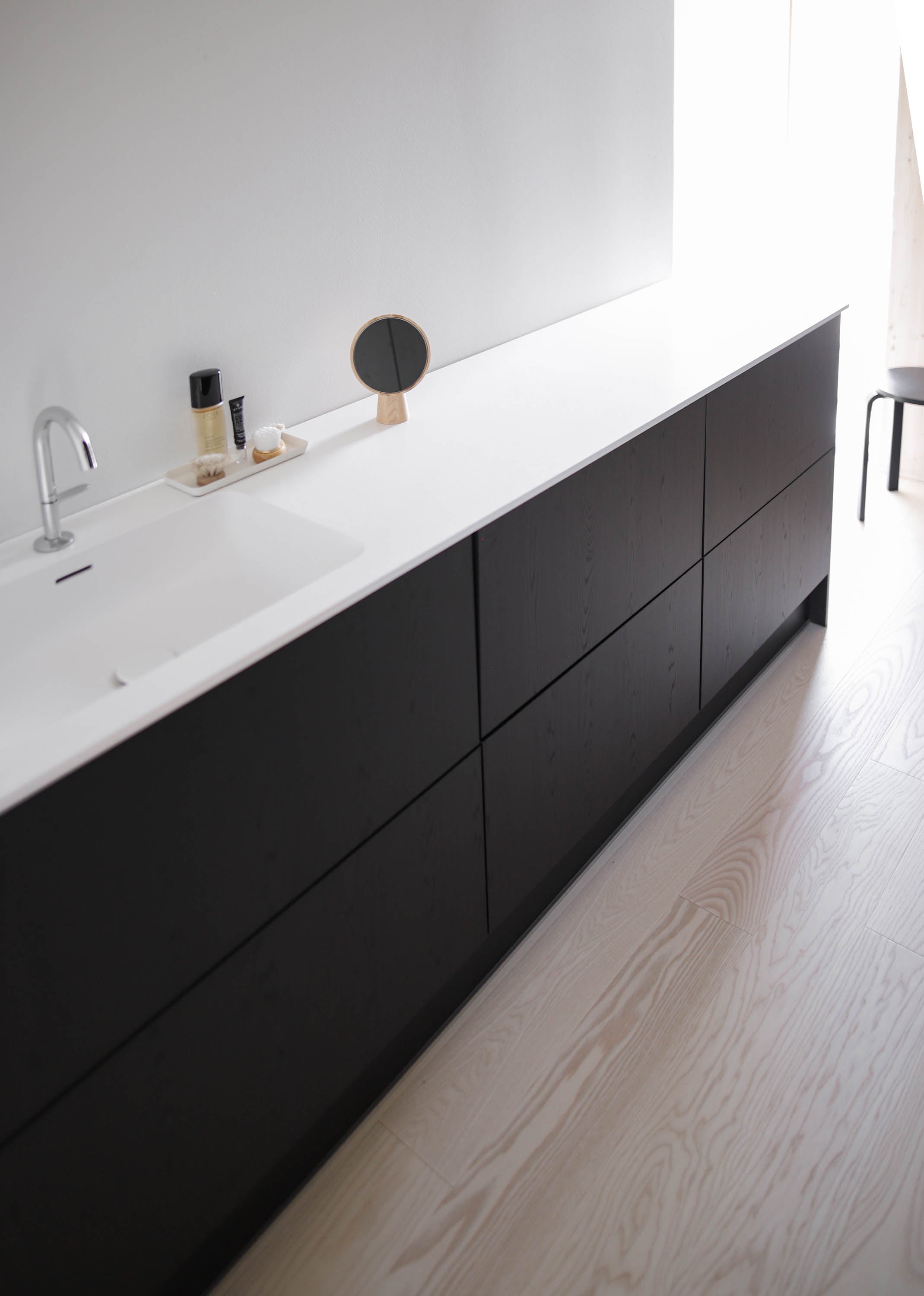 Malliston ovet ovat ryhdikkäät, mutta samalla pehmeät. Vetimien syvyys tuo tilaan hiljaista, eleganttia voimaa. Musta antaa Vireelle vahvan identiteetin, valkoinen taso ja valo puolestaan tasapainottavat kokonaisuutta. Tila tuntuu ylelliseltä mutta kodikkaalta. Se on suunniteltu kestämään aikaa ja palvelemaan. Vireen muotoilu tekee pukeutumisesta rauhallisen rituaalin, ei pelkkää toiminnallisuutta.